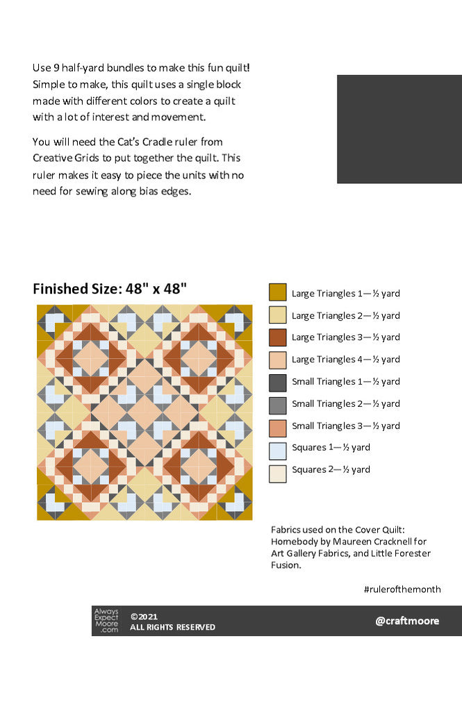 You will need the Cat's Cradle ruler from Creative Grids to put together the quilt. This ruler makes it easy to piece the units with no need for sewing along bias edges.