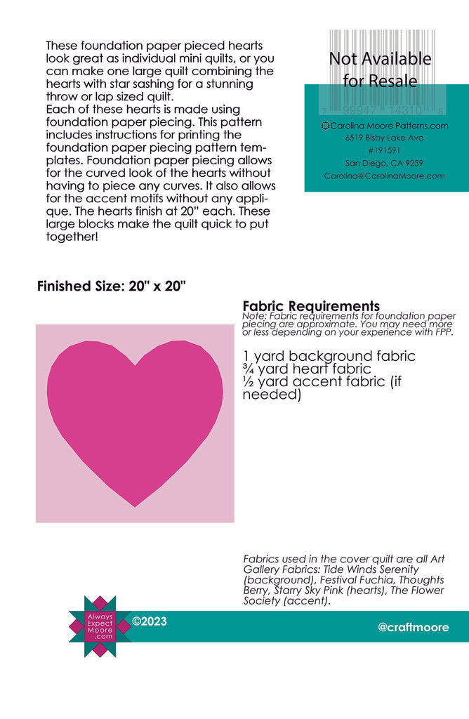 This Solid Heart finishes at 20" square, and makes a great mini quilt or wall hanging. Use it on its own or combine it with other hearts in the Hearts Collection.