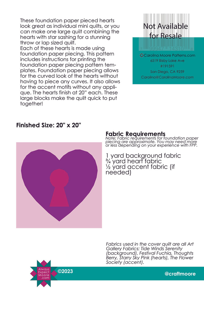 This Keyhole Heart finishes at 20" square, and makes a great mini quilt or wall hanging. Use it on its own or combine it with other hearts in the Hearts Collection.