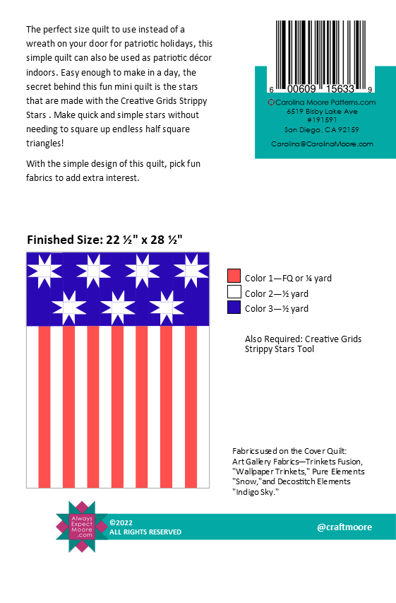 The perfect size quilt to use instead of a wreath on your door for patriotic holidays, this simple quilt can also be used as patriotic décor indoors. Easy enough to make in a day, the secret behind this fun mini quilt is the stars that are made with the Creative Grids Strippy Stars . Make quick and simple stars without needing to square up endless half square triangles!